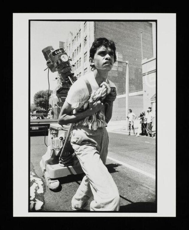 - Black and white photograph showing dancer Terry Roberts pulling heavy machinery down a road. Back reads 'Let's Dance Video 1983 Patrick Jones'. Aboriginal and Torres Strait Islander peoples should be aware that this image includes a deceased person. Photograph taken by Patrick Jones.